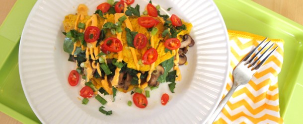 - To serve, top half of one of the chickpea pancakes with half of the veggie mixture. Fold the pancake over and drizzle with the cheese sauce. Top with chopped tomatoes, parsley, and scallions. Prepare the other omelet the same way. Enjoy!
